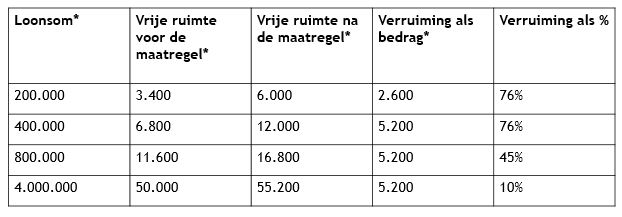 Boven een fiscale loonsom van € 400.000 gaat het percentage van 1,2% vanaf 2021 omlaag naar 1,18%. Deze maatregel is – in tegenstelling tot het bovenstaande – niet tijdelijk.